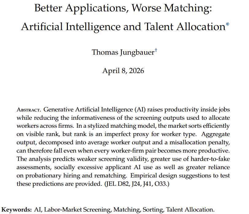 The main message of my new paper “Better Applications, Worse Matching: Artificial Intelligence and Talent Allocation” is simple but important: generative AI can make everyone look better on paper, can, in fact, even make everyone more productive in everything their doing, yet the labor market may be worse off. AI can help applicants write cleaner resumes, sharper cover letters, and more polished work samples. But hiring does not happen after firms fully know who will perform best in the job. It happens earlier, based on imperfect screening materials. The paper shows that if AI improves those materials’ appearance while making them less informative about actual fit, then matching workers to jobs can deteriorate even as AI raises productivity inside every single job.