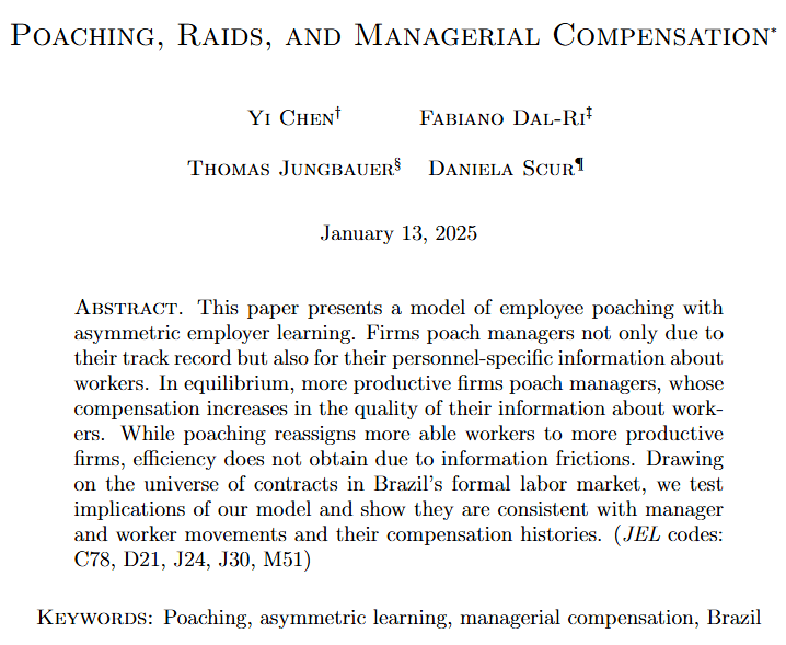 In Poaching, Raids, and Managerial Compensation—joint work with my friends and colleagues Yi Chen, Fabiano Dal-Ri and Daniela Scur—we develop a theory of managerial poaching and subsequent worker raids. We postulate that firms do not only poach managers for their skills but also for their personnel-specific knowledge about workers they supervise. In the equilibrium of our model with asymmetric employer learning, substantially more productive firms poach managers for the option value of identifying high-ability workers. When poaching firms pay thus pay twice for superior worker ability: once indirectly through the manager’s salary and once through the worker’s wage. The ensuing information rent for the manager is a result of firms attempting to protect themselves from raids of their high-ability workers by retaining their manager, leading to adverse selection of workers in the labor market.