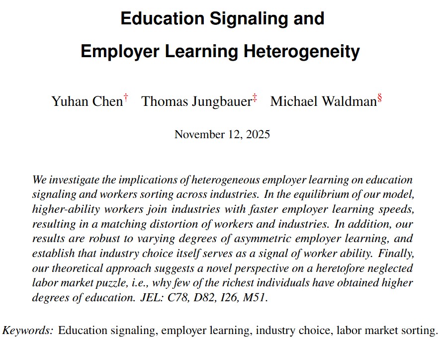 In “Education Signaling and Employer Learning Heterogeneity,” (joint with Yuhan Chen and Michael Waldman), we investigate the consequences of combining these fundamental concepts of Labor Economics. In particular, we exploit the fact that the importance of teamwork and other determinants of the observability of individual output not under the worker’s control vary across industries (and occupations).