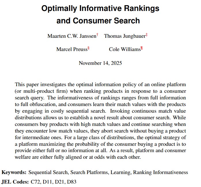 Online platforms (and multi-product firms) generate lists of products (or services) in response to consumer search queries. In ranking these products, platforms draw on their vast amount of information about past consumer search behavior and their purchase history. In “Optimally Informative Rankings and Consumer Search” (joint with Maarten Janssen, Marcel Preuss and Cole Williams), we investigate how much of their pertinent information platforms convey through their rankings of products.